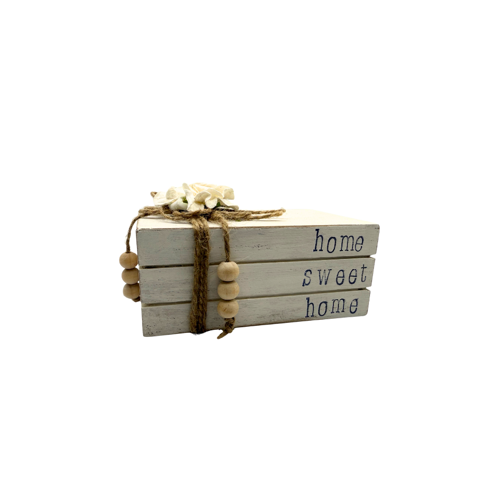Home Sweet Home Floral Book Stack add a cheerful touch to your home with this handmade Home Sweet Home book stack, adorned with a paper gardenia and beads. Perfect for brightening any room, this charming decor piece spreads positivity while showcasing artisanal craftsmanship from local vendors. • Handmade with care by local artisans • Features a beautiful white paper gardenia • Inspires the love of being at home • Ideal for shelves, desks, or entryways • Lightweight and easy to display