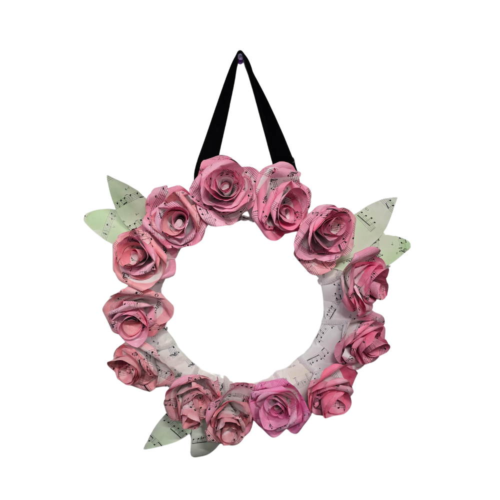 Add some charm to your home decor with our Pink Music Paper Flower Wreath. This 13-inch diameter wreath features a beautiful sheet music pattern, adding a touch of warmth and elegance to any room. Perfect for music lovers or as a unique gift.